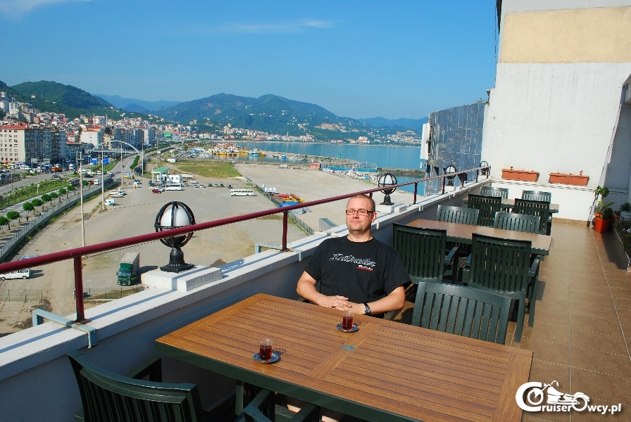 Dnia piątego Szczepan wstawszy upiornie wcześnie (no co ja poradzę, że on tak miał codziennie) poszedł do sklepu po zakupy, a potem zrobił śniadanie (WOW). No proszę Państwa z taką ekipą to ja mogę jechać wszędzie ;). Ustaliliśmy, że zrobimy sobie dla odmiany lajtowy dzień, małe zwiedzanie, a potem plaża i piwko, albo plaża gdzieś po drodze, wszak przy morzu będziem jechać. Plan był genialny…. Bakczysaraj zaliczyliśmy wg planu. Agat próbował się w pałacu chana rozgościć pakując się z butami na zabytkowy dywan, ale Panie z obsługi były czujne i szybko ukróciły te barbarzyńskie zapędy. Przed pałacem na mini jarmarku popróbowaliśmy miejscowych specjałów jak baklawa, „świeczki” z soku oraz pierogi z nadzieniem. Przy okazji o Szczepana się dwie przekupki prawie pobiły, miał chłopak wzięcie ;). Zadowoleni ruszyliśmy ku Jałcie, żeby dalszą część planu zrealizować, czyli znaleźć jakąś przyjemną knajpkę nad morzem, wykąpać się i zjeść szaszłyczka. Taaa… znaleźć to myśmy znaleźli … przepiękne winkle i cudny WIDOK na morze, bo do samego morza był jakiś kilometr w linii prostej i pod dużym kątem w dół spadającej. Dodam jeszcze tylko, że był mega upał i ta kąpiel w morzu od samego rana chodziła mi po głowie. Szukając świętego Graala czyli kawałka ładnej plaży ćwiczyliśmy jazdę po winklach, nie wiedziałam, że cruiser się tak może złożyć. Szacun dla chłopaków, a największy dla mojego męża, bo wiadomo, że jak się jedzie z Plecakiem to jest dużo trudniej. Jednak jak już się uda zgrać to przyjemność jest…. Sami się domyślcie ;). Jednakże po jakiś 3 godzinach winklowania przyjemność zdecydowanie przygasła i chcieliśmy już bardzo na kwaterę. Udało nam się dotrzeć przed wieczorem, jako, że plaża roiła mi się przez cały dzień to użyłam całej siły perswazji, żeby wszystkich na kąpiel jeszcze namówić. Argument, że woda będzie cudownie ciepła, a pływanie idealnie rozluźni po męczącym dniu jakoś do nich przemówił. Ruszyłam do morza pierwsza, nieco zastopowały mnie glony kłębiące się niczym puszcza amazońska przy brzegu, w poszukiwaniu kawałka wolnej przestrzeni zrobiłam krok w bok i …. I tak już zostałam bowiem koło nogi dostrzegłam wielką meduzę, a zaraz obok drugą i trzecią i … dziesiątą. Zawód na twarzach wszystkich był wyraźny, no i trudno się dziwić, bo lorneta z meduzą to ja rozumiem, ale żeby sama meduza! I w dodatku stadnie… Zdegustowani poszliśmy na lornetę ;). Zanim jednak to trzeba było uzupełnić fundusze i tu nastąpił mały zgrzyt albowiem okazało się, że karty z chipem bankomat nie obsługuje. Na szczęście na kolegów zawsze można liczyć, ze stoickim spokojem stwierdziliśmy więc z Damianem, że przechodzimy na utrzymanie Agata ;). Po 5 dniach na moto trzeba się było nieco pogimnastykować, więc z braku kąpieli w morzu urządziłam wieczorek taneczny ;). Na parkiecie dzielnie towarzystwa dotrzymywał mi Tomy oraz sterroryzowany mąż ;). To był kolejny udany dzień i biorąc pod uwagę, że zrobiliśmy tylko jakieś 400km rzeczywiście lajtowy.